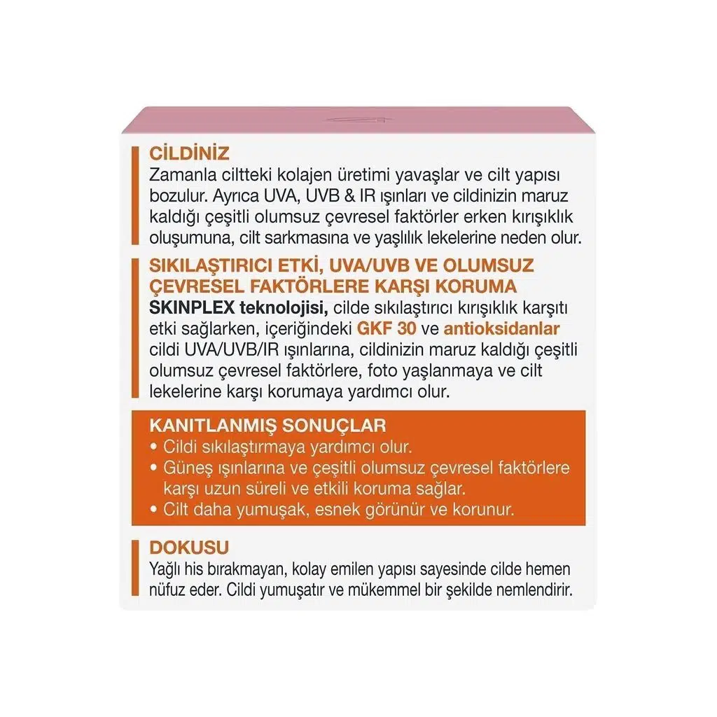 DDLift+Protection Kırışıklık Karşıtı Gündüz Kremi 50 ml İçerisindebulunan bitkisel bileşenler kolajen liflerinin üretimini arttırarak kolajenağının yapılandırılmasına ve sıkılaşmasına destek olur.; ; İçeriğindeki Soya Hyaluronu cildi nemlendirerek yumuşatır ve cilde esnek birgörünüm kazandırır.; ; Zararlı UVA/UVB ışınlarına ve çevresel faktörlere karşı cildi uzun süre etkilibir şekilde korur.; ; Cildi sıkılaştırmaya yardımcı olur.; ; f doğal kaynaklı içeriklerden oluşur.; ; Ürün Orman Yönetim Konseyi’nin belirlediği standartlara uygun olaraküretildiğini gösteren FSC sertifikasına sahiptir.; Bu logoyu taşıyan ürünler,biyolojik çeşitliliği koruyacak şekilde bilinçli olarak ağaç tüketildiğinigaranti eder.; ; Kullanımı Her sabah cildinizi temizledikten sonrauygulayın.; Göz çevresine uygulamaktan kaçının.