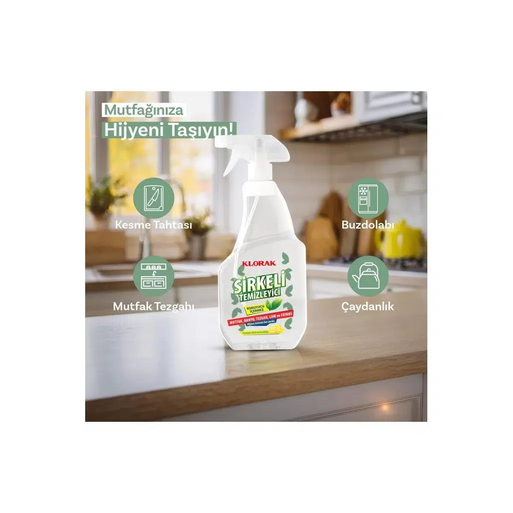 - Klorak sirke içeriği sayesinde, zorlu lekelerin bile kolayca çıkarılmasına yardımcı olur. - 750 ml hacmiyle uzun süreli kullanım imkanı sunar; sık sık yeniden doldurma ihtiyacını azaltır. - 6 adet paketi ile evdeki temizlik ihtiyaçlarınızda ekonomik bir çözüm sağlar. - Türkiye menşeli olmasıyla yerel kaynaklardan elde edilmiştir, bu da hem kaliteyi hem de sürdürülebilirliği garanti eder.